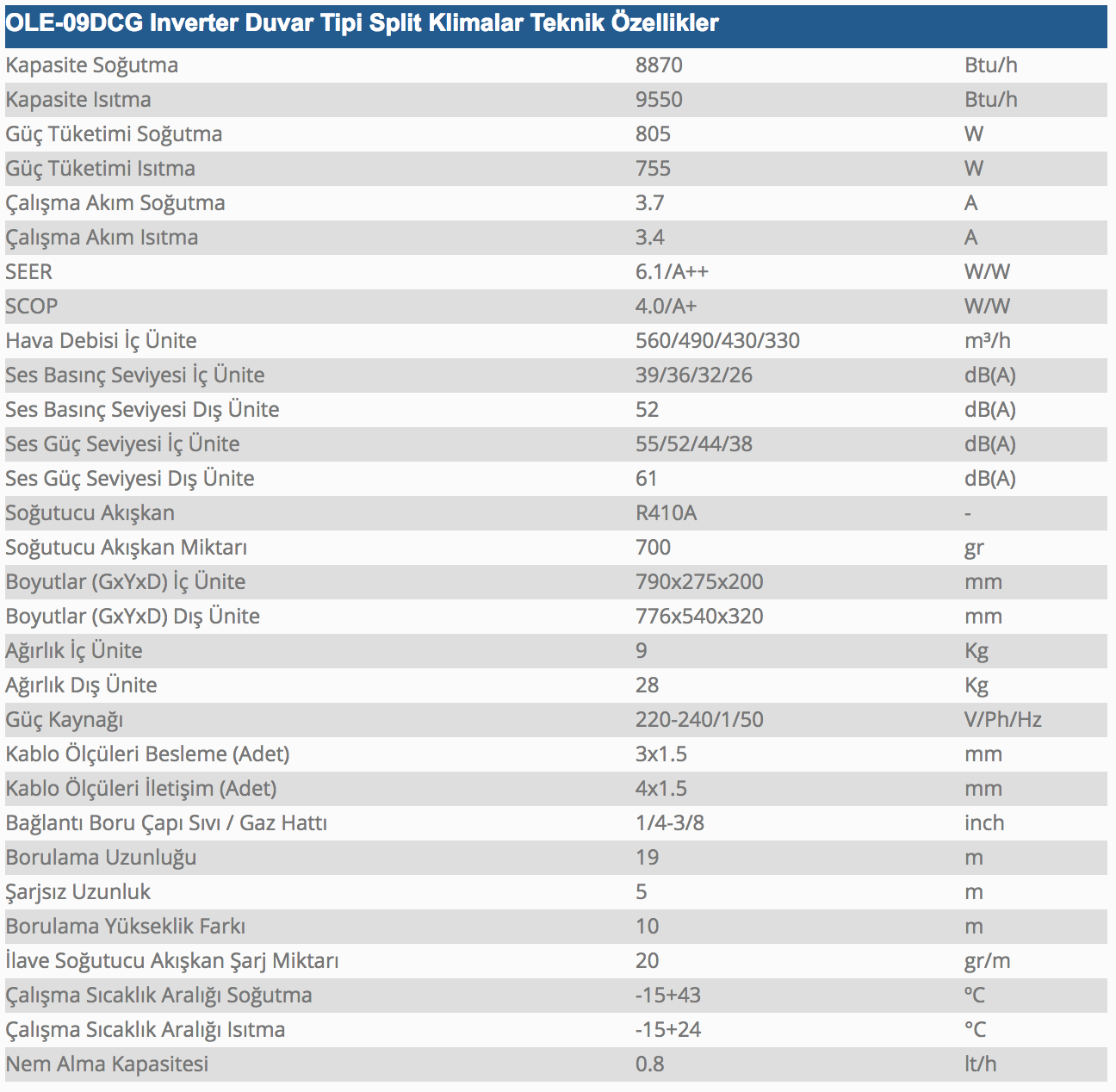 Sezonsal verimliliğe uygun A++ enerji sınıfı, Wifi teknolojisi, standart 6+1 filtre, standart iyonizer teknolojisi, sağ-sol aşağı-yukarı otomatik salınım, I feel teknolojisi, siyah panel, gri gövde, gizli led ekran, -15°C soğutma ve ısıtma, yüksek borulama teknolojisi, 8°C´de soğuk koruması, kendi kendini kurutma özelliği, üniversal iç ünite, standbyda 0.5 watt elektrik tüketimi