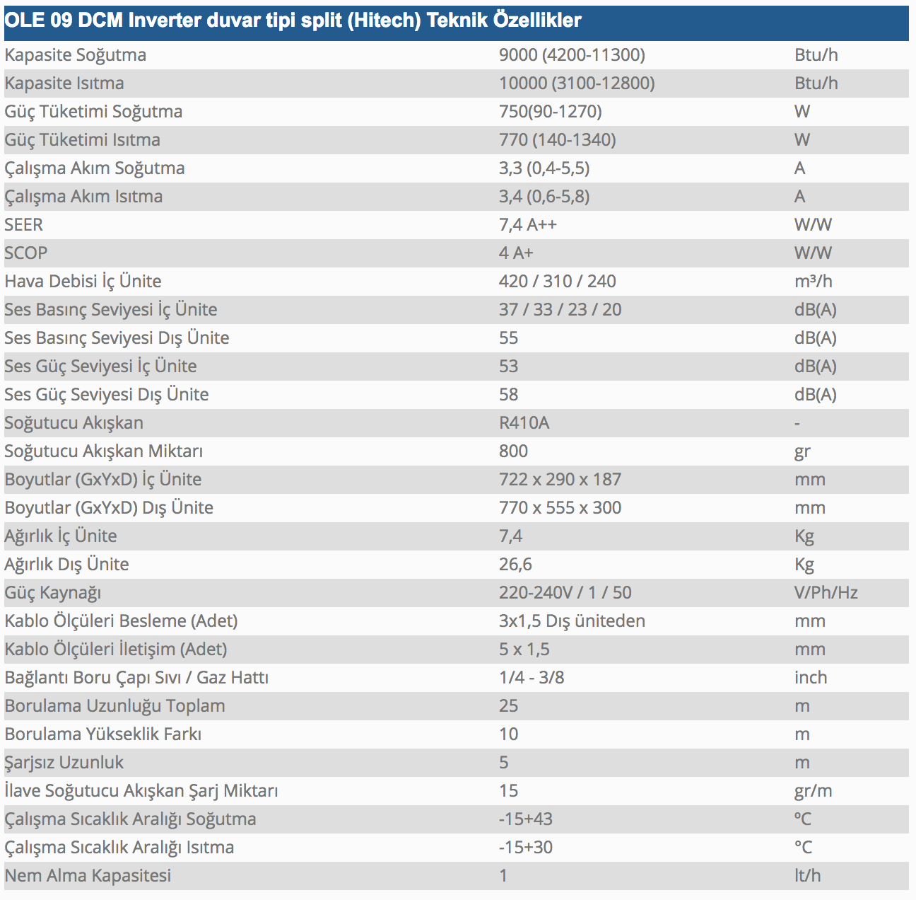 Sezonsal verimliliğe uygun, yüksek verimli, uzun borulama mesafesi, sessiz çalışma konumu, gizli led, hayalet kasa iç ünite, sağ-sol ve aşağı yukarı otomatik salınım, 8°C´de koruma çalışması, kendi kendini kurutma özelliği, -15°C´de soğutma yapabilme ve standbyda 1 watt elektrik tüketimi