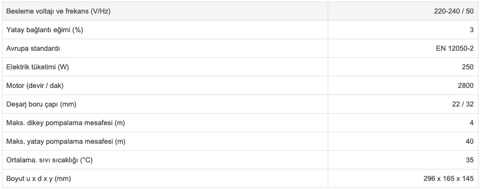 - Sanishower® pis su pompası atık suları dikey 4 metre, yatay 40 metreye kadar tahliye edebilmektedir.